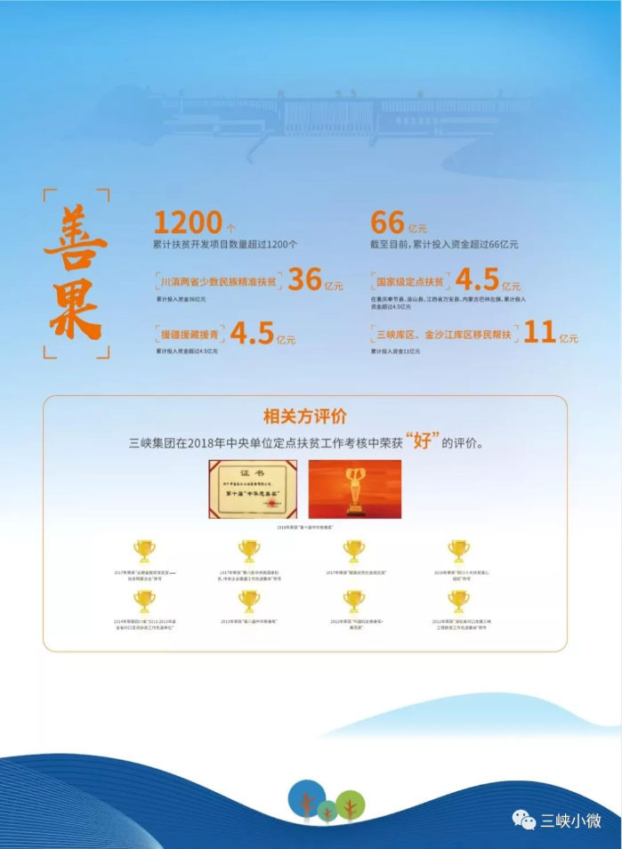 在展览中,大发彩票 紧紧围绕展会主题和定位,以“善若水、润天下”的社会责任理念为主线,通过“善心”“善行”“善果”“善愿”等四个板块,重点以图片、数据、视频等,简洁生动地展示了集团公司聚焦深度贫困地区和贫困群众,围绕产业扶贫、教育扶贫、基础设施扶贫、健康扶贫、安居扶贫等方面开展的一系列具有三峡特色的扶贫实践和主要成效,吸引众多观展者前来参观。