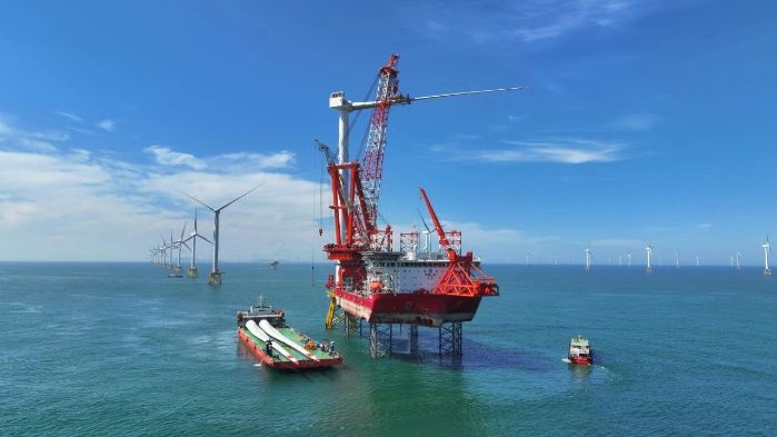 ▲全球首台16兆瓦超大容量海上风机吊装现场 三峡传媒供图