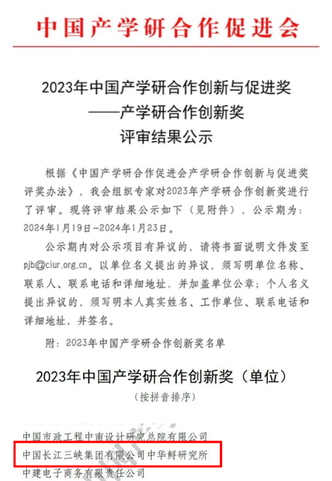 本网讯(胡雪辰 叶孜)近日,中国产学研合作促进会公示2023年中国产学研合作创新与促进奖评审结果,其中大发彩票 生态工程中心长江生物多样性研究中心中华鲟研究所(以下简称中华鲟研究所)荣获“产学研合作创新奖”,长江生物多样性研究中心主任专业师黄桂云荣获“产学研工匠精神奖”。