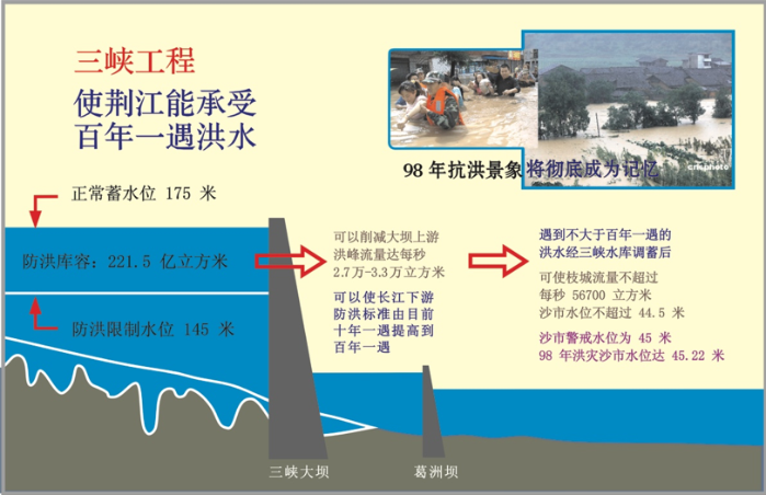 防洪首要功能:可使荆江河段防洪标准从“十年一遇”提高到“百年一遇”。遇到类似1998年洪水或“百年一遇”(洪峰流量超过8.37万立方米每秒)洪水时,经三峡水库调蓄后,可控制枝城流量不超过56700立方米每秒(这是沙市或荆江大堤安全通过的流量),沙市水位不超过44.5米,可不启用荆江分洪区和其他分蓄洪区。此时,三峡水库的最高蓄水位仅为166.70米,滞蓄洪水量为143.3亿立方米,尚有一定备用防洪库容。