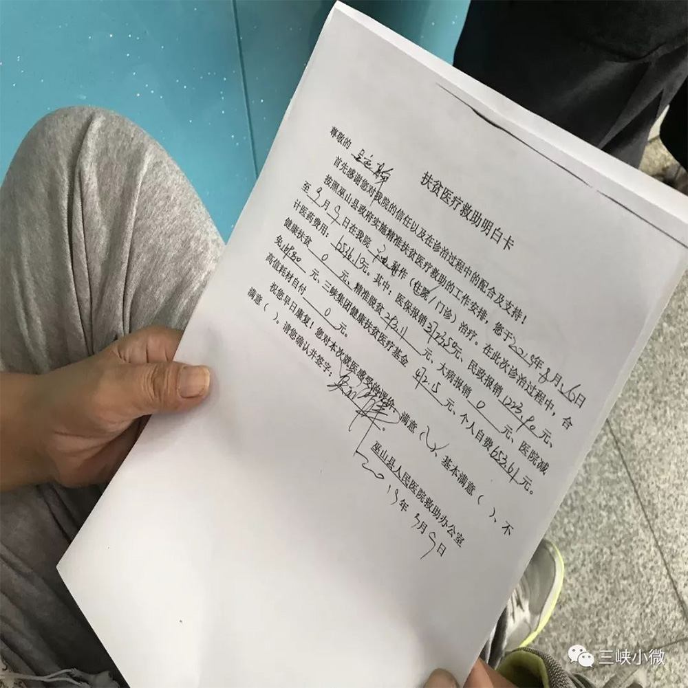 在巫山、奉节,贫困户就诊,实行“先诊疗、后付费”的“一站式”结算,即建档立卡贫困人口在全县范围内医疗保险定点医疗机构入院,不再需缴纳住院押金,只需出院时在该医院专用窗口直接办理“一站式”医疗费用结算。患者只需缴纳个人自付部分,其他可享受政策内报销费用一次性兑现,避免贫困患者不同部门、不同窗口重复跑、反复跑,有效解决贫困患者的“垫资”压力和“跑腿”负担。