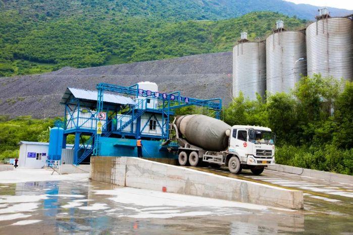 一辆满载混凝土砂石骨料的罐车驶入工地,将物料倾倒入工作仓面后,赶往混凝土罐车冲洗点“洗澡”——清理罐车内部,防止砂石渣料残留,影响骨料配比。