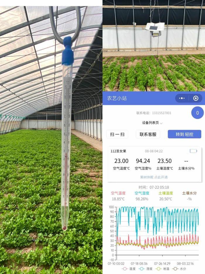 在农业温室大棚内部仔细观察可以发现,农业数字化应用成果颇具亮点。200多座大棚内全部应用了温度和湿度实时监控装置,温度数据会实时传送到手机软件上,帮助工作人员分析温室大棚里的环境条件。同时,大棚内地面敷设有自动洒水装置,当大棚内温度升高,自动洒水装置将启动洒水,既可以进行降温,又可以进行农作物灌溉。大棚外的遮阳保温篷布则通过定时控制装置进行升起与降落,白天时全部敞开,到了夜晚就会自动关合,确保了温室大棚内农作物在白天受到充足的日照,在夜间还可以保持恒温状态。