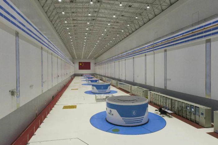 长龙山电站坐落在群山之间,沿进厂交通洞向山体内行进1.2公里,来到长龙山电站的厂房。232米长的厂房内,6台35万千瓦的机组一字排开,其中4台机组上方亮起一圈红色灯光,通过机顶罩的小窗口可以看到飞速旋转的转子。
