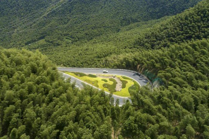 乘车穿行在上下水库之间,我们可以看到明线道路每个回头弯都经过了精心设计,树木、草地、景观石等元素巧妙搭配,每一处都是一个个性十足的小公园,满眼绿色触手可及;每一条隧道尽头都是不一样的景致,奇山怪石一一呈现。