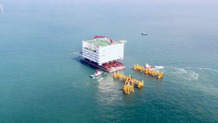 在设计环节,由于如东海上换流站的重量是一般海上升压站的4-6倍,常规的一体式导管架不适合这个庞然大物,为此振华特别运用了分体式导管架施工工艺,将换流站的“基座”一分为二,合理进行布局;在运输环节,换流站由陆入江采用了滑轨运输法,在制造基地到江边这段距离里搭建一条轨道,让换流站滑行入江,最后再由江入海;在安装环节,采用浮托安装法,用一种类似“搭积木”的方式将换流站与导管架拼合,并且将拼合误差控制在了毫米级。