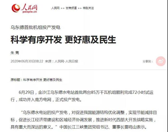 【人民网】乌东德首批机组投产发电:科学有序开发 更好惠及民生