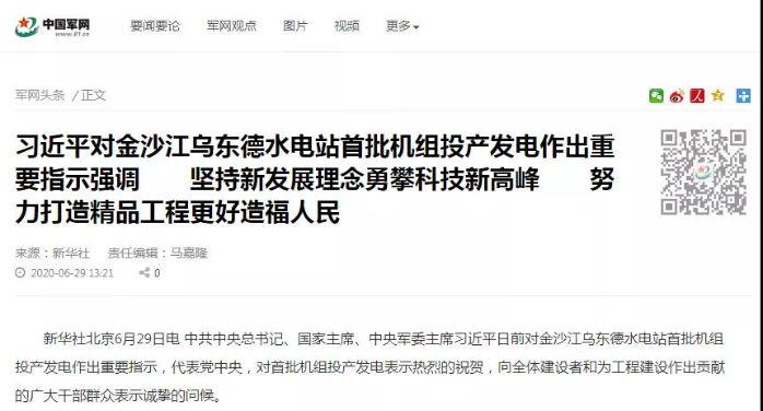 【中国军网】习近平对金沙江乌东德水电站首批机组投产发电作出重要指示强调 坚持新发展理念 勇攀科技新高峰 努力打造精品工程更好造福人民