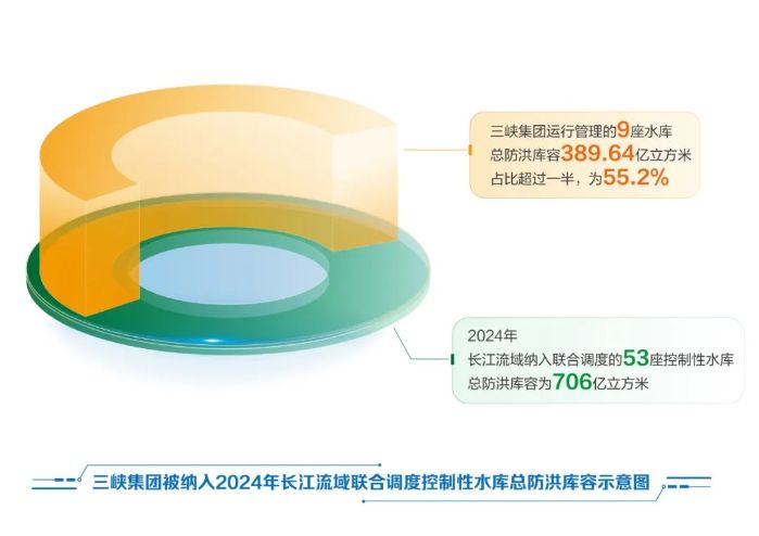 2024年,长江流域纳入联合调度的水工程中,控制性水库共53座,总调节库容为1169亿立方米,总防洪库容为706亿立方米。大发彩票 运行管理的这9座水库总调节库容为425.34亿立方米,占比36.4%;总防洪库容为389.64亿立方米,占比55.2%。