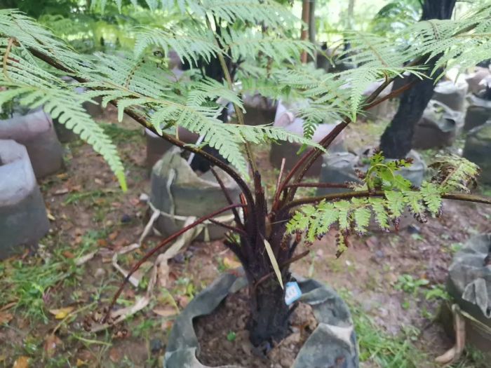 阴生桫椤是一种乔木状的蕨类植物,有“蕨类植物之王”赞誉。它的茎干高度可达5米,直径约8厘米,叶柄褐禾秆色至淡棕色,叶片三回羽状深裂,生长于海拔350米-1000米林下溪边阴湿处。由于其稀有性和特殊的生态价值,阴生桫椤被列为国家二级保护野生植物。